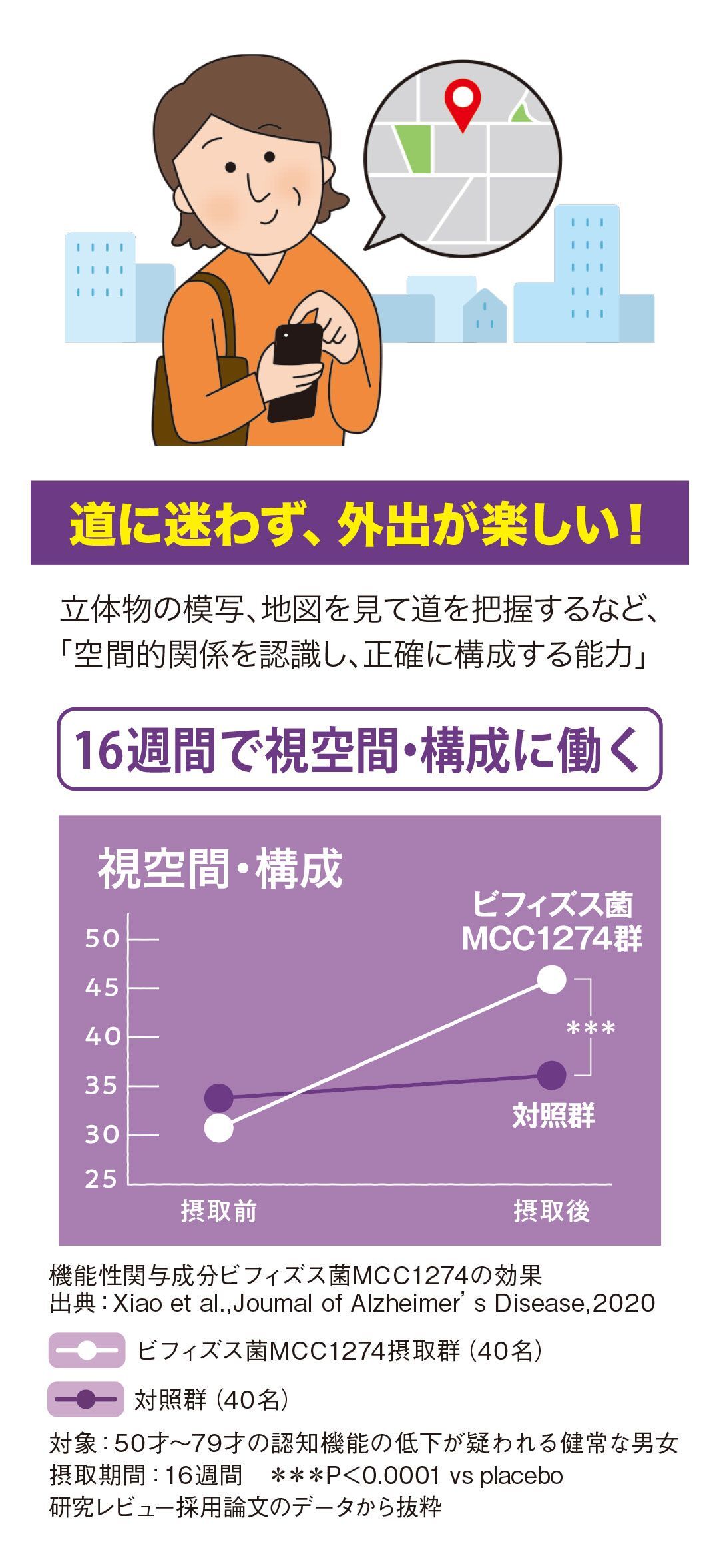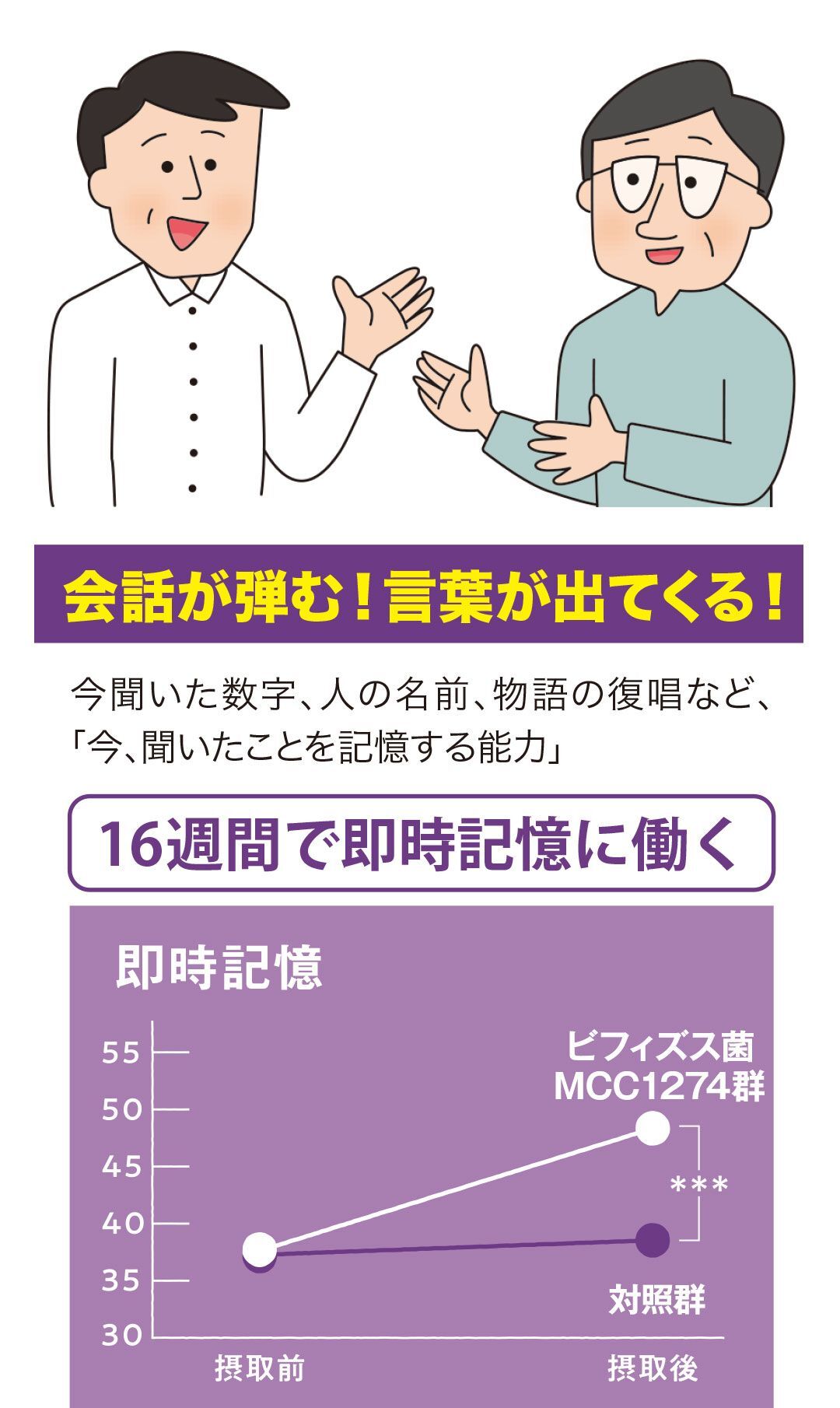 研究の中で〈ビフィズス菌 MCC1274〉が認知機能の一部である記憶力※を維持する作用があることを発見し、